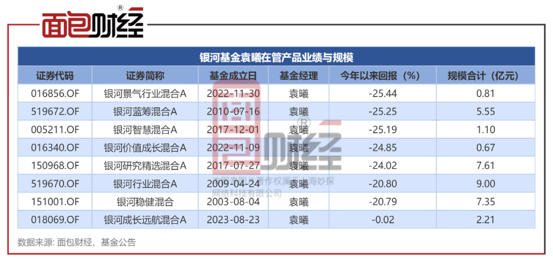 银河蓝筹混合的基金经理袁曦目前共管理8只基金,最新规模均不超过10亿元,半数产品规模小于3亿元。除了其中一只今年8月新成立产品,其余产品年内回撤均超过20%。