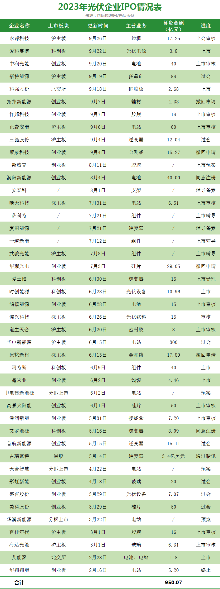 国际能源网/光伏头条(PV-2005)统计,今年以来有43家光伏企业更新了IPO进程,总计拟募资超950亿元。