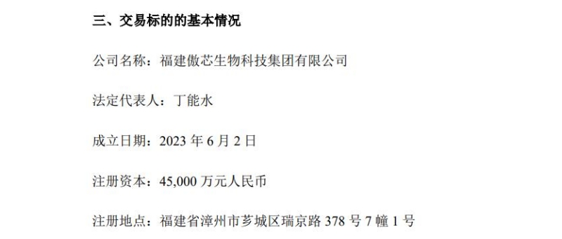 公告披露,目标公司傲芯生物成立于2023年6月2日,注册资本为4.50亿元,目前傲农生物对其持股100%;不过,按成立时间算,至今才几个月,其控股权就拟对外转让,略显着急。