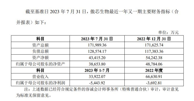 但奇怪的是,公告竟然披露了傲芯生物最近一年又一期主要财务指标(合并报表),其中显示,2022年度和2023年1-7月,傲芯生物归母净利润均为亏损,分别为-3692.81万元和-5443.92万元,合计亏损近亿元。