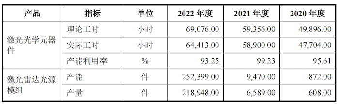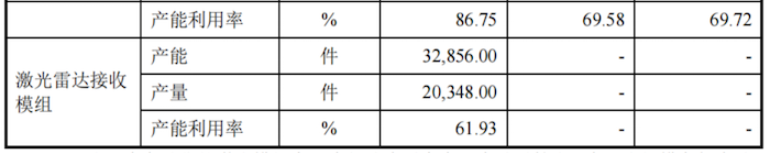 值得注意的是,招股说明书披露的激光雷达光源模组、激光雷达接收模组的产能利用率口径中的产量与产销率口径中的产量存在数据“打架”情况。