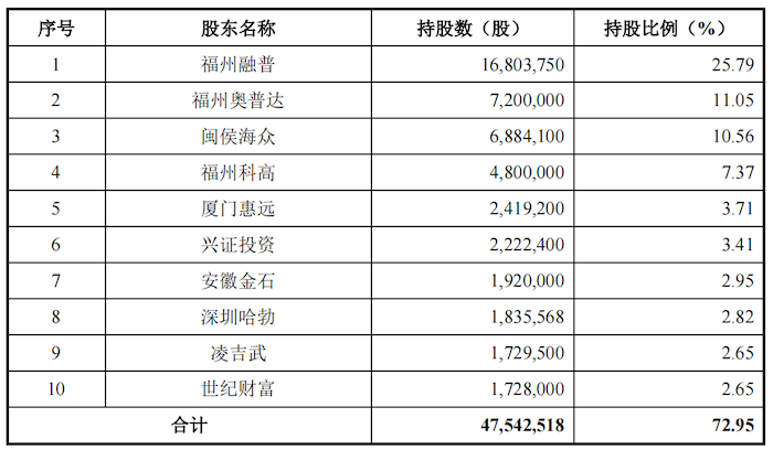 值得注意的是,海创光电的股权结构较为分散。公司实际控制人为凌吉武,本次发行前,凌吉武直接持有公司仅2.65%的股权。同时,凌吉武持有公司控股股东福州融普66.67%的股权,通过福州融普控制公司25.79%的表决权。
