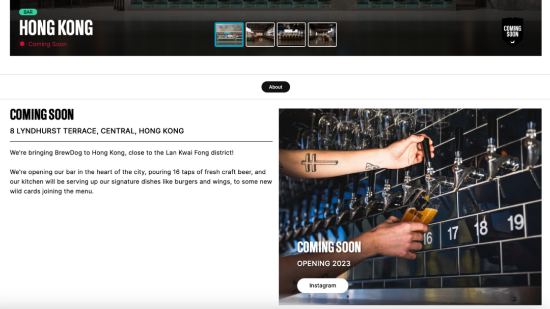 打开酿酒狗官网,即可以看到定位为HONG KONG的酒吧写着硕大的“coming soon”,开设日期则显示为2023年内。与百威中国合作事实上早有端倪。早在今年3月底,酿酒狗便已开始借助福建莆田百威雪津啤酒厂,代工生产Punk IPA和其他精酿啤酒。