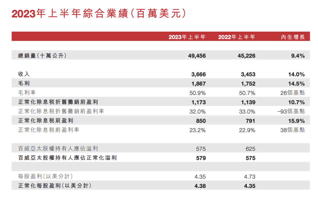 根据百威亚太2023年中报告显示,上半年其正常化除息税折旧摊销前盈利率下降至32.0%,同比减少0.93%,归母净利润同比下滑8%,降至5.75亿美元。