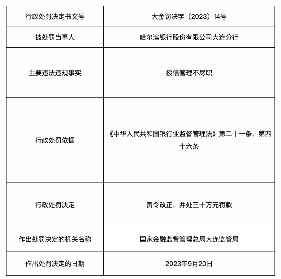 9月25日,国家金融监督管理总局大连监管局行政处罚信息公开表显示,2023年9月20日,哈尔滨银行股份有限公司大连分行因授信管理不尽职,被责令改正,并处三十万元罚款。