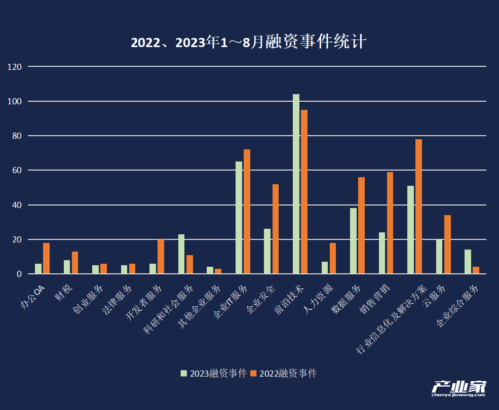 可以发现,从2023年融资事件、金额平均减少百分比来看,IT服务、云服务并没有逆势增长,但减少的融资事件和金额均在平均值之上。这意味着其并未成为拖后腿的一员。