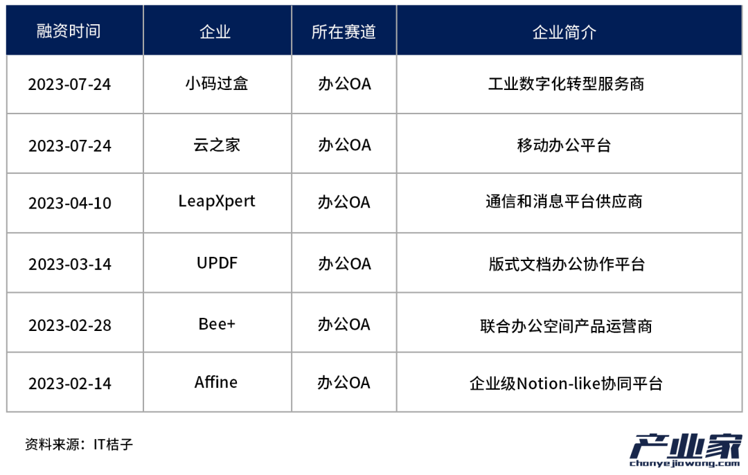 具体来看,移动办公平台云之家获数亿元人民战略投资;工业数字化转型服务商小码过河获战略投资;版式文档办公协作平台UPDF获得由汉仪股份领投的1600万人民币战略投资。