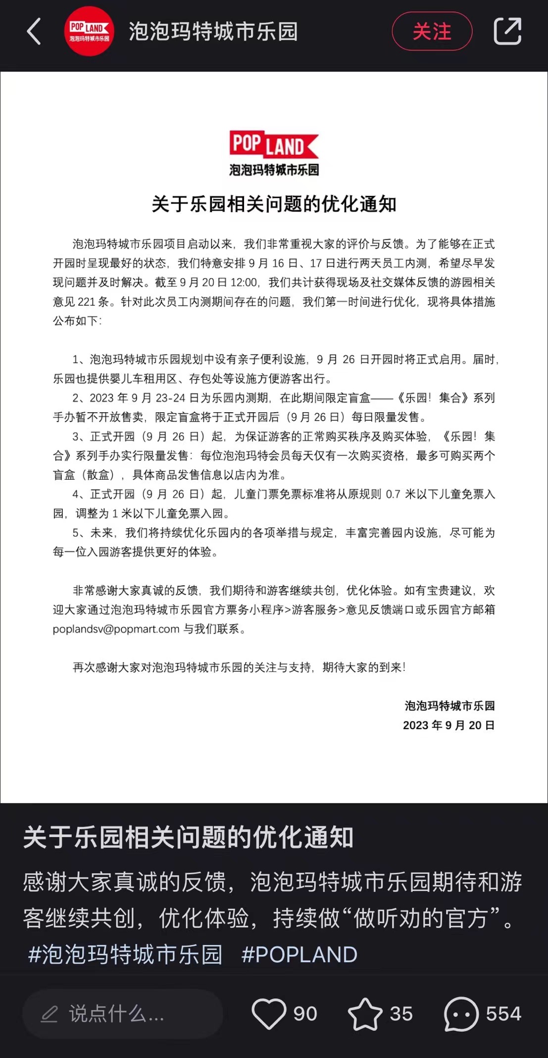 根据收集到的游客反馈,9月20日,泡泡玛特发布了关于乐园相关问题的优化通知,其中下调了《乐园!集合》系列手办的限定购买数量,每位泡泡玛特会员每天仅有一次购买资格,最多可购买两个盲盒散盒。