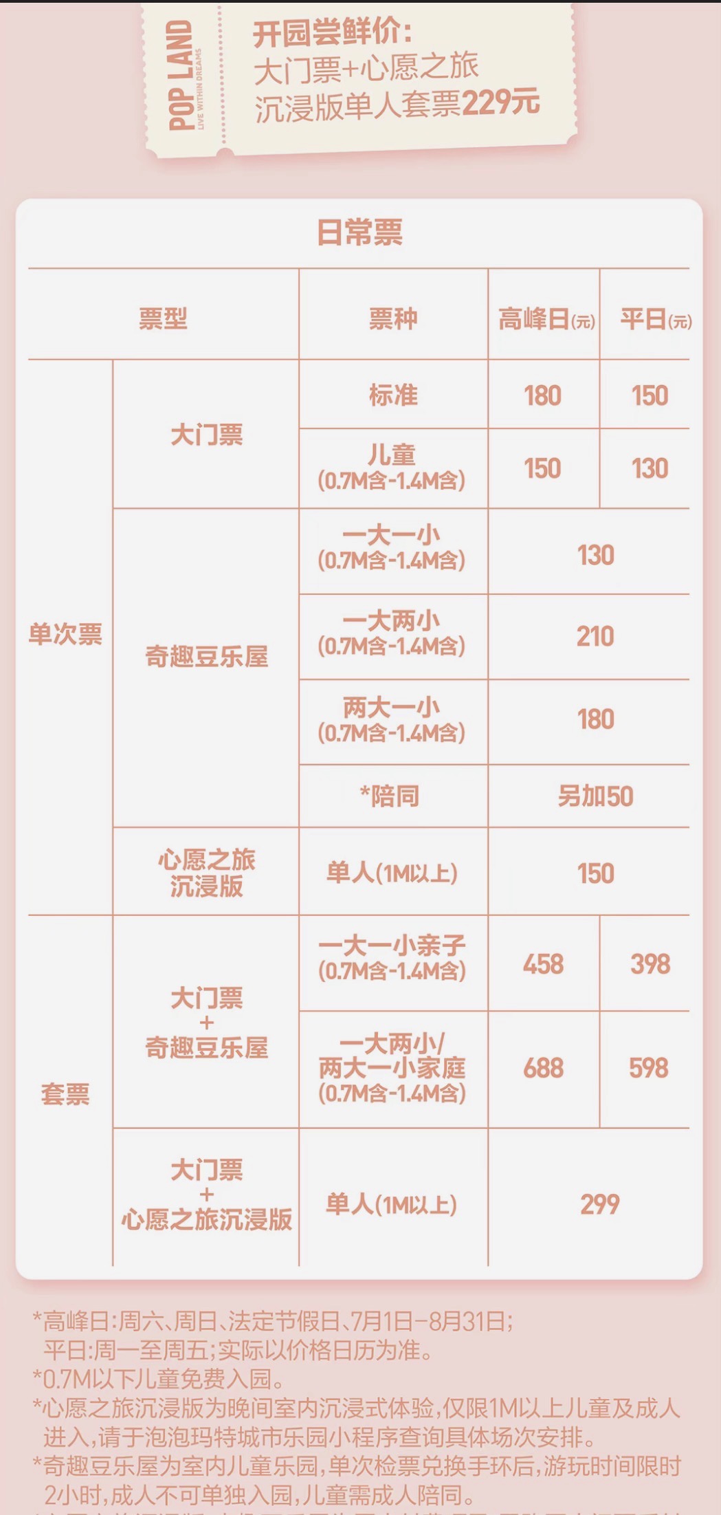 在价格上,平日标准大门票为150元,儿童票为130元;周末及节假日的高峰日标准门票180元,儿童票150元。除了门票外,还有大门票+心愿之旅沉浸版的套票,价格为229元,预订须知中显示,心愿之旅为晚间室内沉浸式互动体验。门票之外,还有室内儿童乐园“奇趣豆乐屋”项目可以购买,价格为一大一小130元,单儿童票80元,陪同票50元。