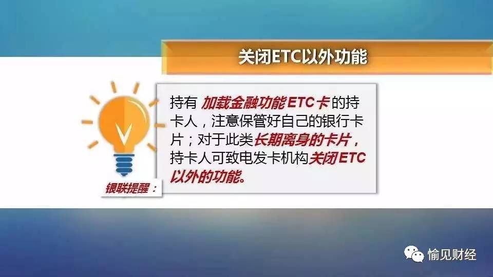 第一,如果这张IC卡加载了金融功能、车主又打算插在ETC车载器里,长期不带在身边的话,银联提示车主,可以致电发卡机构关闭这张银行卡除ETC、也就是除了“不停车电子收费系统的缴费”以外的所有功能。这样做,很显然,当一台作为其它消费功能的POS机来盗用的时候,这张卡也就不会响应了。