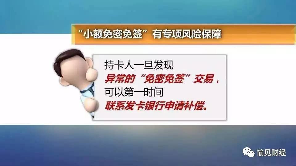 第三,也请大家不必过于担心资金风险。之所以一台POS机靠近就能盗用,是因为这张卡片有“小额免密免签”支付功能,也正是因为这“免密免签”,银联联合各商业银行,是给予这种特殊业务专项风险保障的。所以持卡人一旦发现异常的交易,您没输密码也没签字的,可以第一时间联系发卡银行申请补偿。