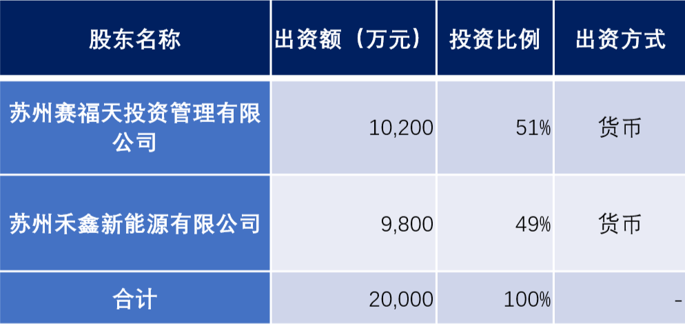 2022年12月23日,赛福天全资子公司苏州赛福天投资管理有限公司(“赛福天投资”)拟与苏州禾鑫新能源有限公司(“禾鑫新能源”)共同投资设立合资公司。该合资公司——苏州赛福天新能源技术有限公司(“赛福天新能源”)注册资本为2亿元。其中,赛福天投资认缴出资1.02亿元,占注册资本的51%;禾鑫新能源认缴出资9800万元,占注册资本的49%。