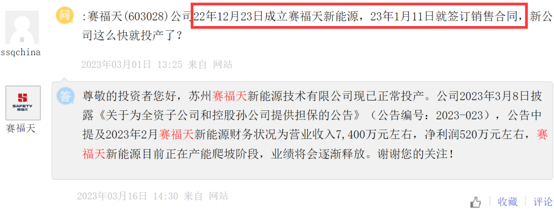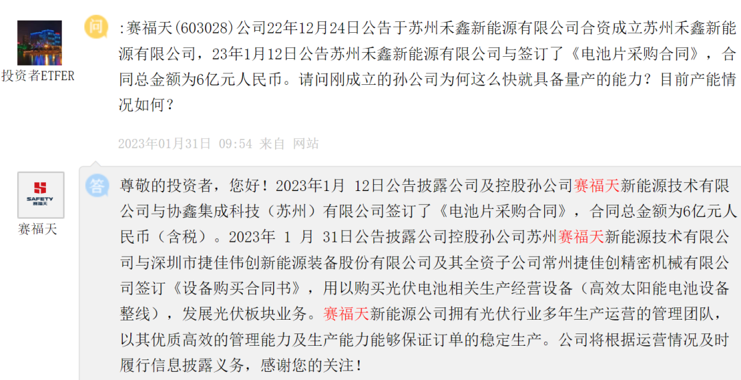 投资者自然也关注到了上述问题,数次在上证e互动提问。但是,赛福天都无法给出合理解释,仅在回复中提到今年1月31日曾购买捷佳伟创的设备。然而,从时间节点上看也比较奇怪——在赛福天1月31日对捷佳伟创采购设备之前,公司的PERC电池就已经投产了。
