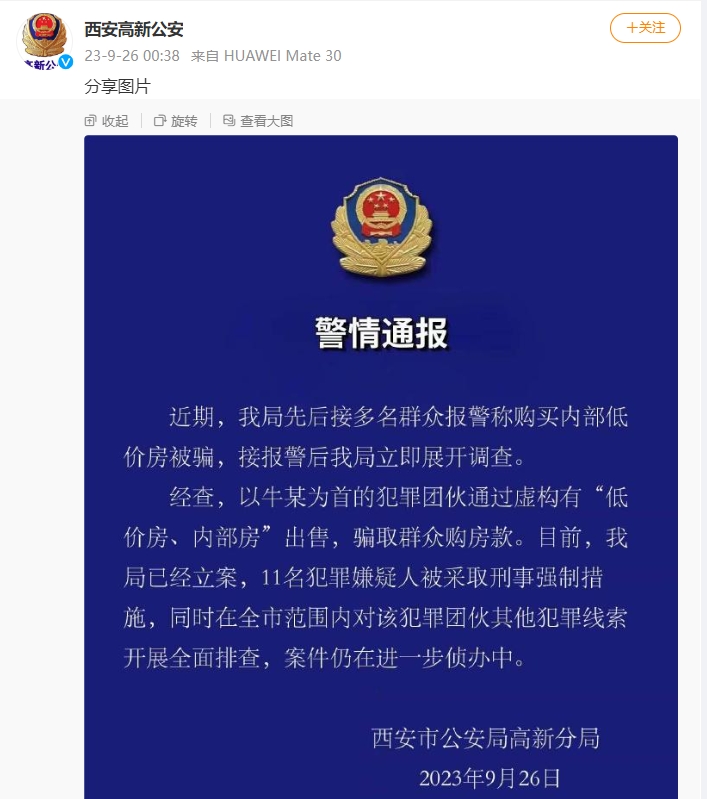 据西安高新公安微博9月26日凌晨通报消息,近期,该局先后接多名群众报警称购买内部低价房被骗,接报警后警方立即展开调查。经查,以牛某为首的犯罪团伙通过虚构有“低价房、内部房”出售,骗取群众购房款。目前,警方已经立案,11名犯罪嫌疑人被采取刑事强制措施,同时在全市范围内对该犯罪团伙其他犯罪线索开展全面排查,案件仍在进一步侦办中。