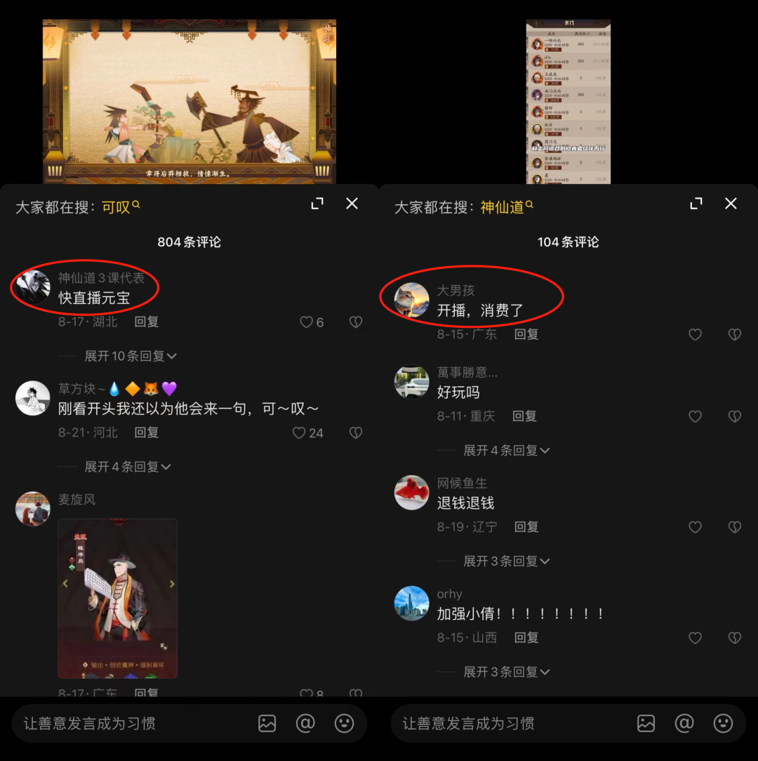 其次,主播和玩家是处于同一时空里的,所以在直播时会立刻回复玩家的问题,加强与玩家的互动,透过这个即时互动,可以明白观众想要什么,包括心理需求与物质需求,这样就可以用直播间的商品去满足观众。《神仙道3》在直播过程中,经常会与玩家互动,甚至在视频评论区还会有玩家催促“开播”。