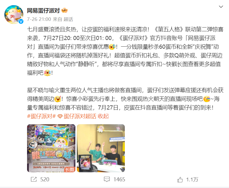 在直播形式上,《蛋仔派对》采用两位主播边讲解边展示,推出了0.01元抢60蛋币以及9.2折蛋币充值优惠从而吸引玩家进入直播间。除此之外,《蛋仔派对》还邀请KOL参与直播,为直播预热,提高热度。