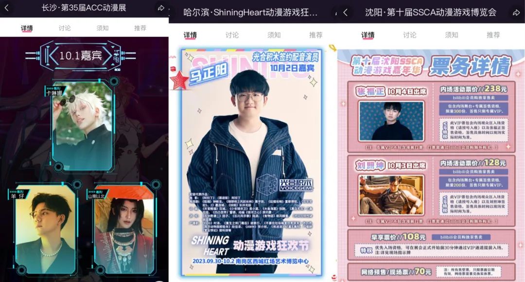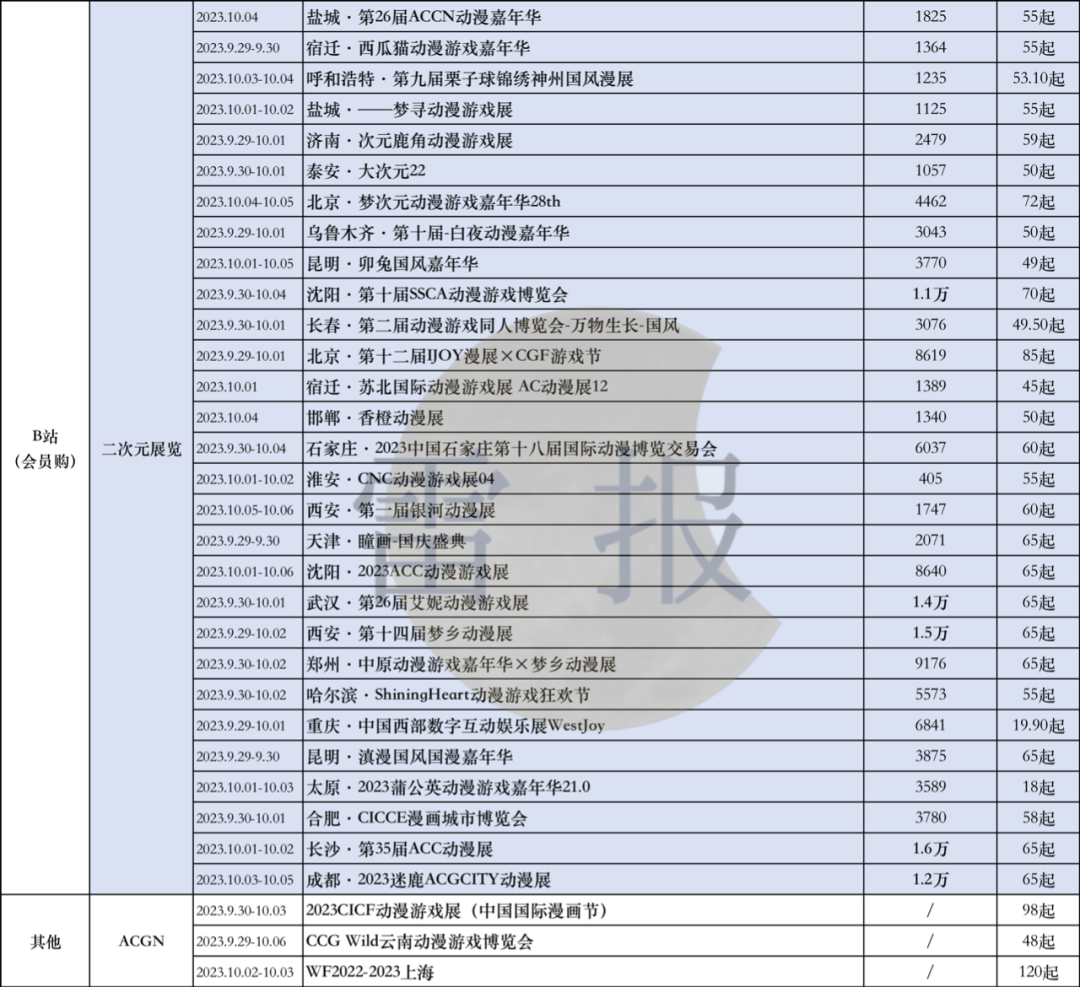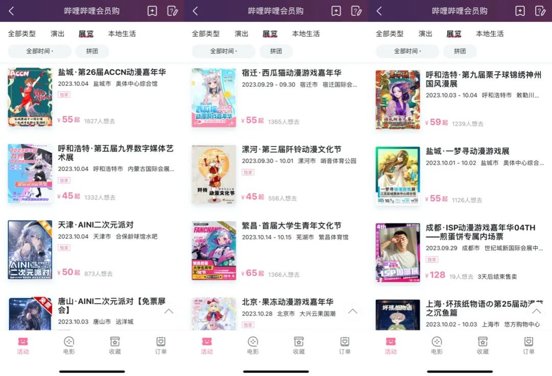 再来看B站,以上为近30起的二次元类的活动,但也只是来自平台的部分,从中可见在国庆假期期间(包含中秋),全国的漫展类活动的数量的确是不少的,整个市场看起来颇为蓬勃。