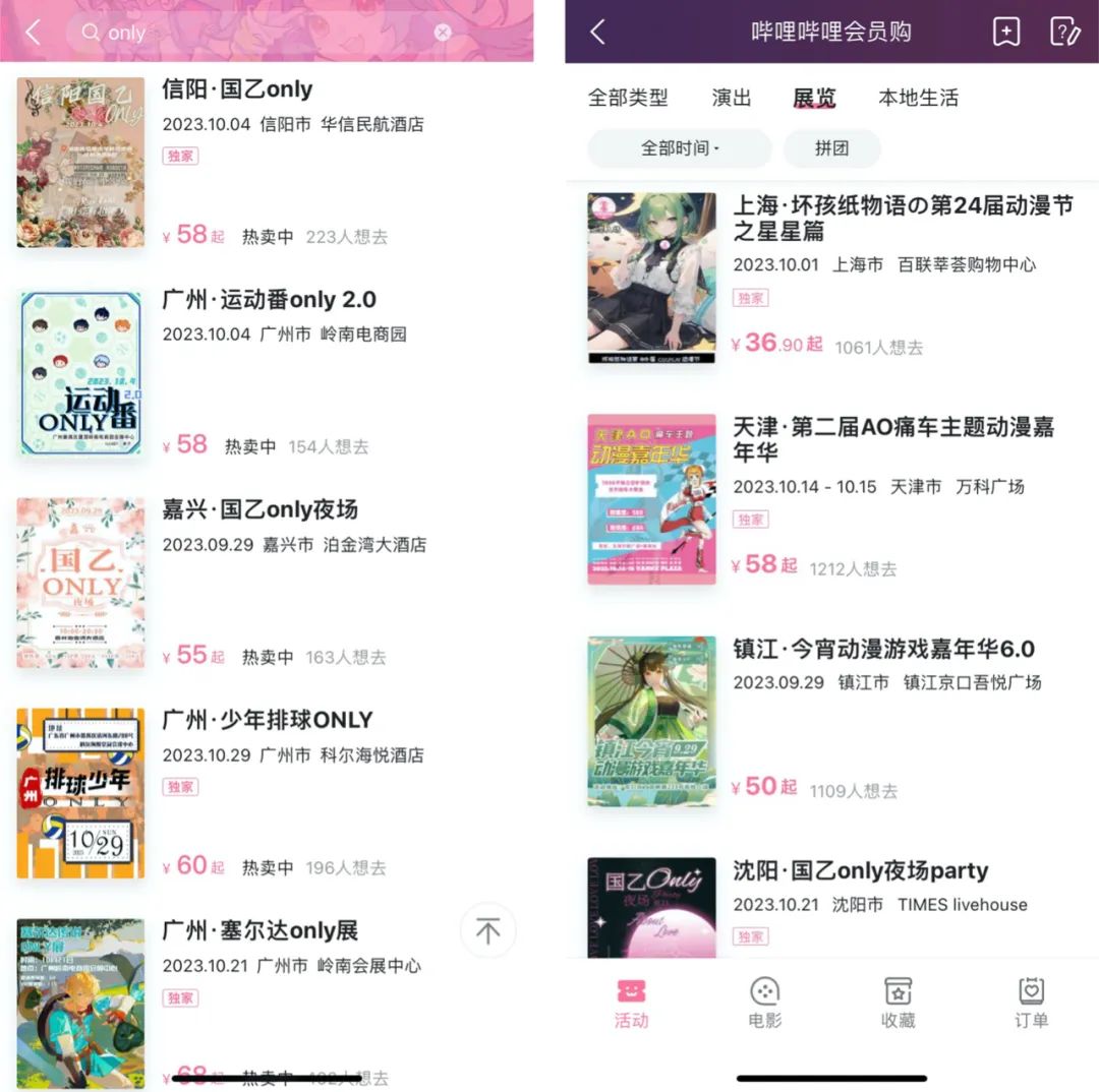 我们主要统计了大麦和B站会员购这两大票务平台,前者涵盖活动类型较广,比如演唱会、演出等等,后者则覆盖了大量国内次元文化活动门票的售卖。
