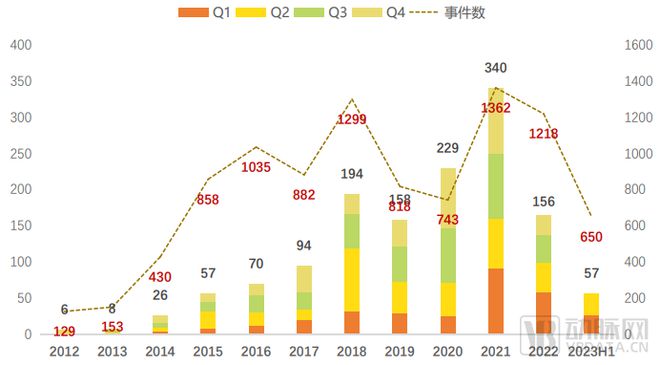 中国2012-2023H1年各季度融资总额及事件数(单位:亿美元),图片来源:《2023年H1全球医疗健康产业资本报告》