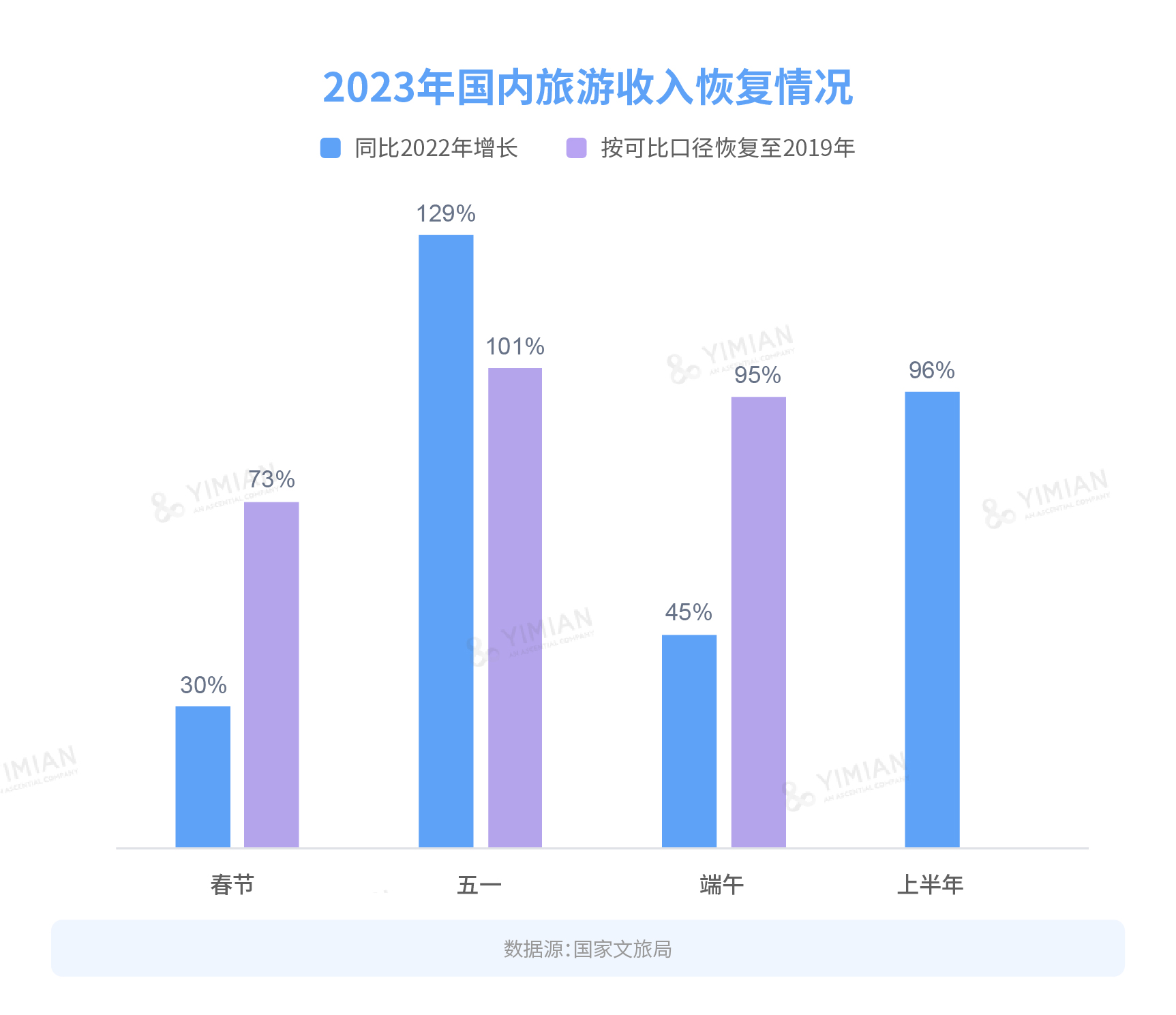 随着2023年出行政策放缓,旅游行业的复苏有目共睹。据文旅局,2023年上半年,国内旅游收入同比增长95.9%,各小长假同比2019年也有不错的恢复情况。