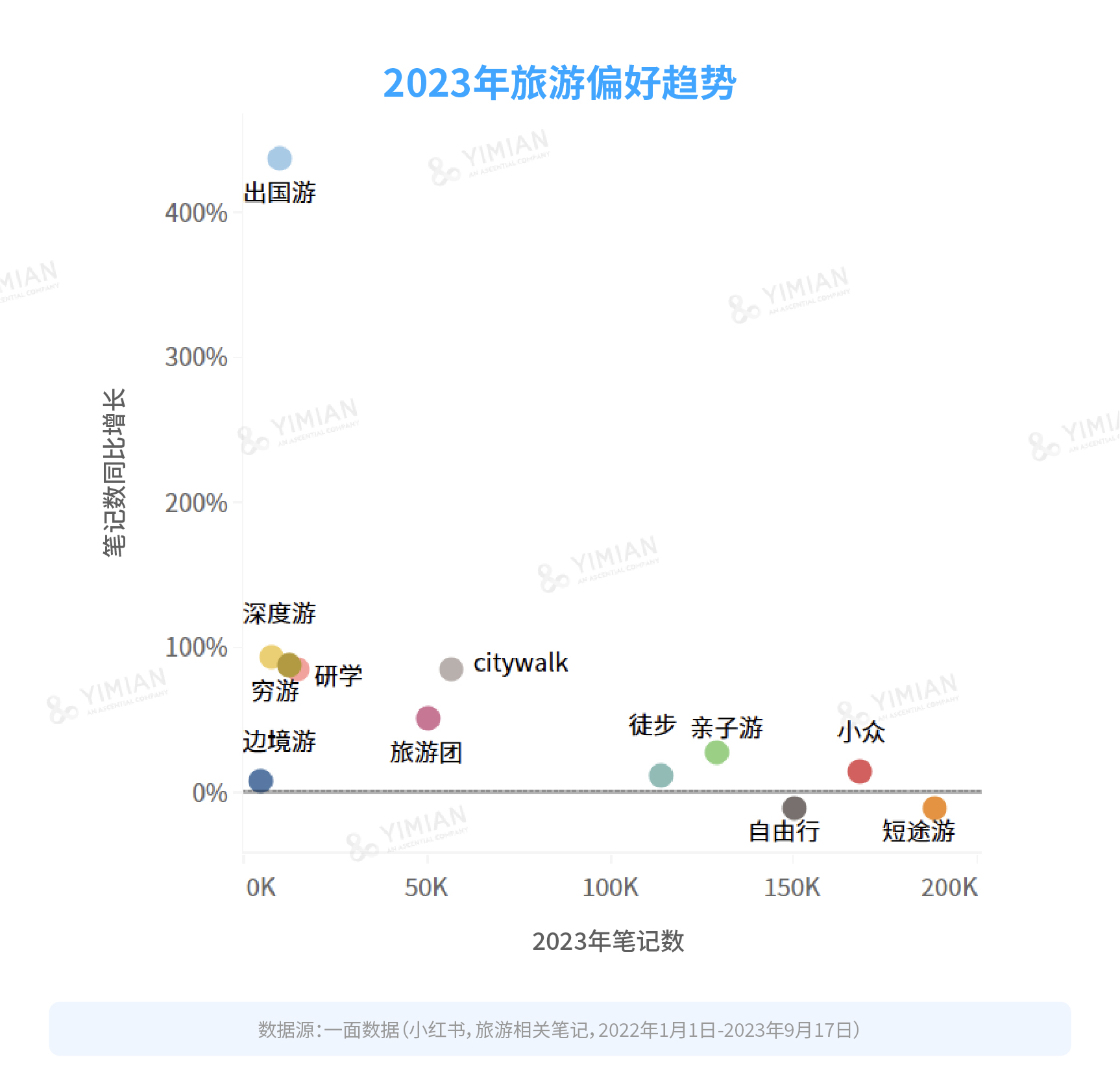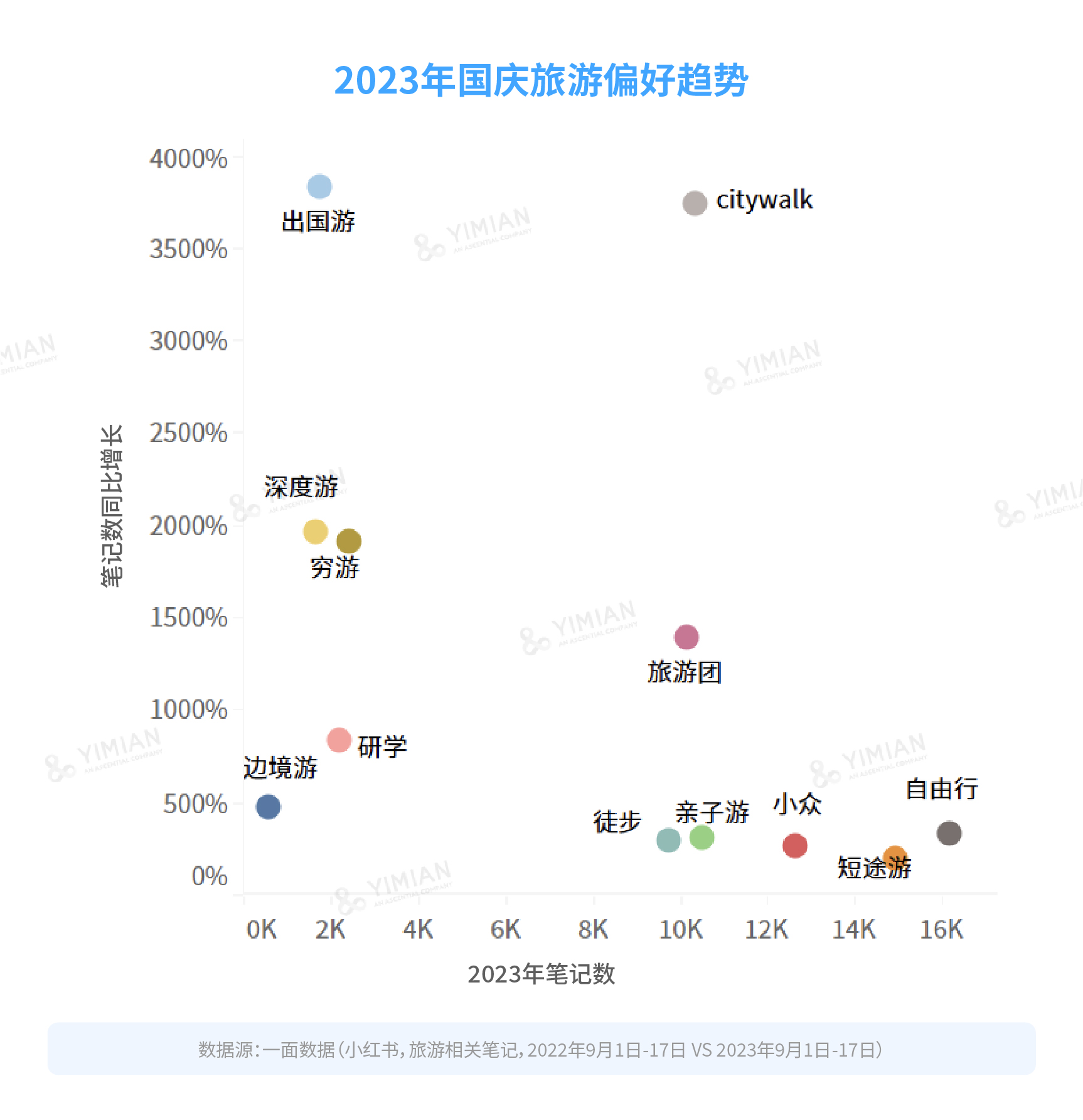 如果进一步细分到国庆的情况,citywalk和出国游无疑是最显眼的,各类旅游偏好均处于同比增长状态,这个中秋国庆黄金周值得期待。