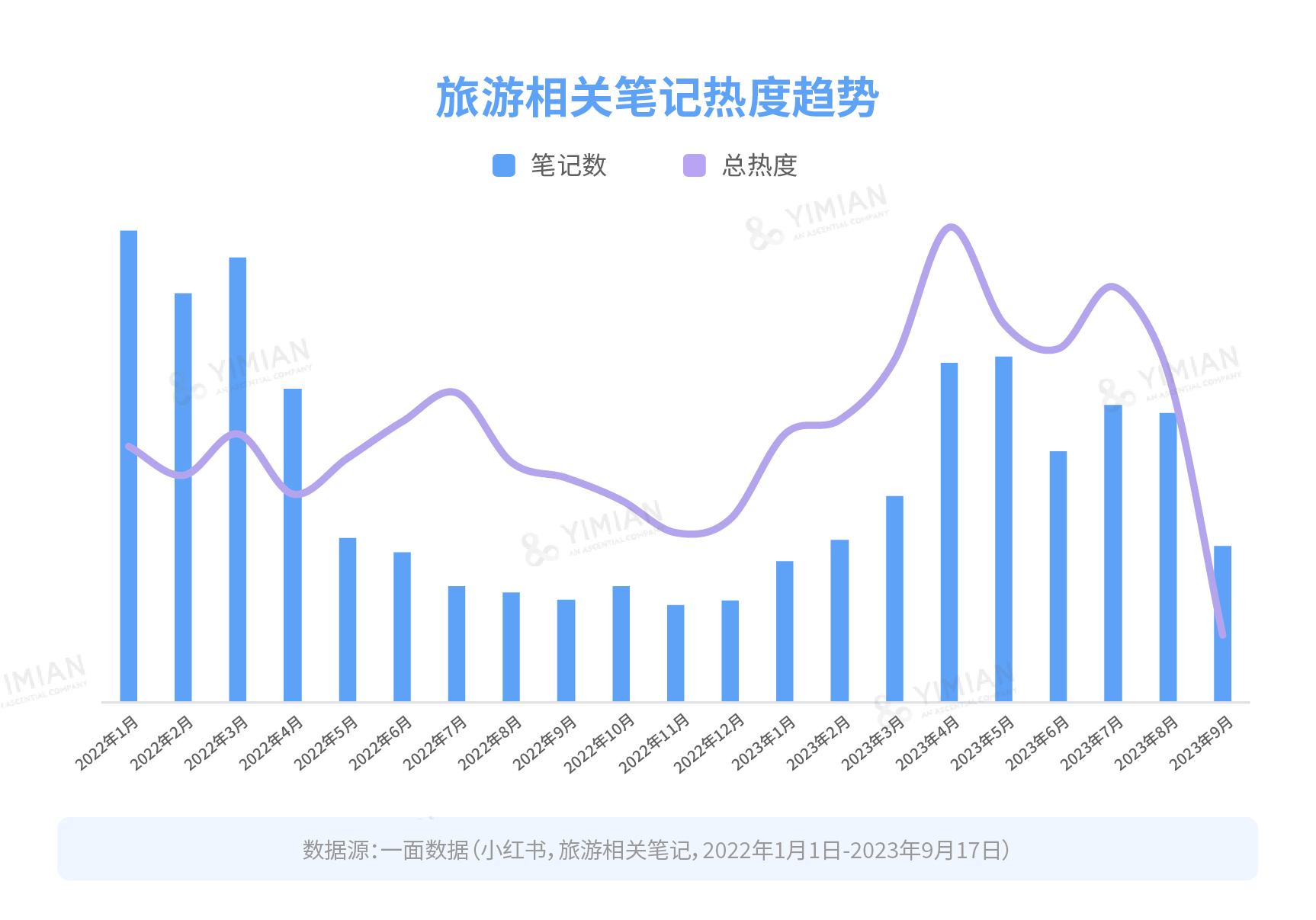 2022年1-4月时旅游还处于一个热烈讨论的状态,各类攻略、新闻、宝藏城市汇总帖层出不穷;自2022年5月起笔记数下降明显,热度并未随之下降,大家对外面的风景还抱有向往,不断点赞收藏评论。笔记和热度在2022年11月达到谷底,随后持续爬升,2023年在五一前后、暑假期间都维持着较高水平。