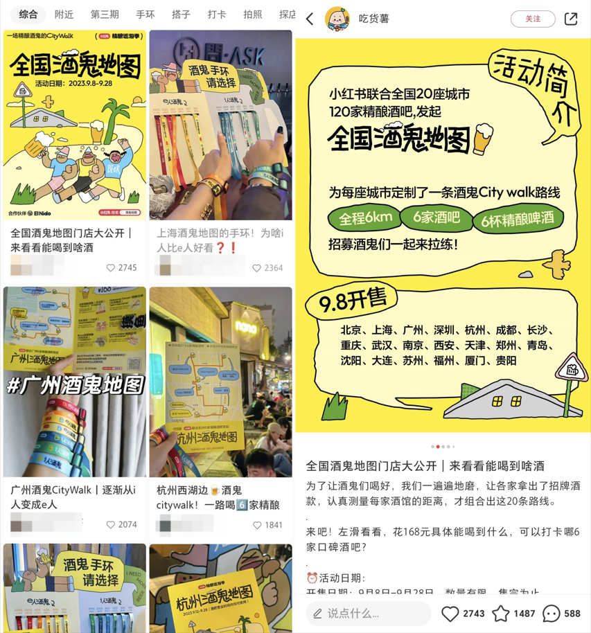 在这次活动中,小红书挑选了20个城市,设计了酒吧主题的citywalk,参与者可以沿着路线打卡当地口碑酒吧,价值168元的地图套票可以在6家酒吧喝6杯酒,近乎半价,属实是非常良心的薅羊毛活动了。