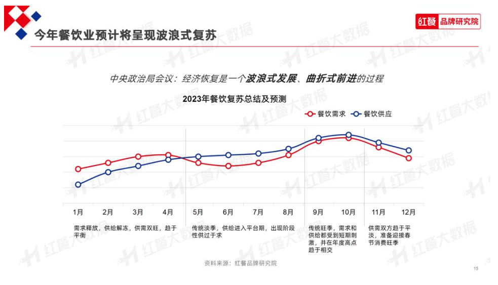 具体表现为,1月—4月为供需双旺的阶段;5月—8月是传统的餐饮淡季,出现阶段性供过于求;9月—12月,受中秋国庆长假影响,预计餐饮需求和供给在短期刺激下将有一定幅度的提升,到达年度高点。