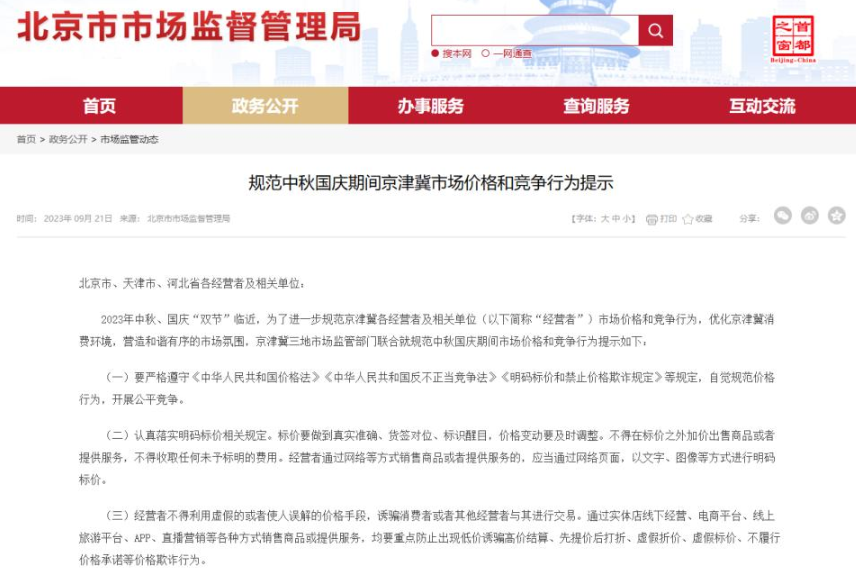 除此以外,西安、四川、江苏、山西等省份以及哈尔滨、南京市、厦门市、武汉市等旅游城市也均先后发布通告规范“国庆”市场价格,进一步保障消费者利益。