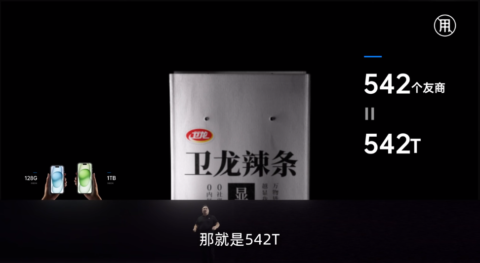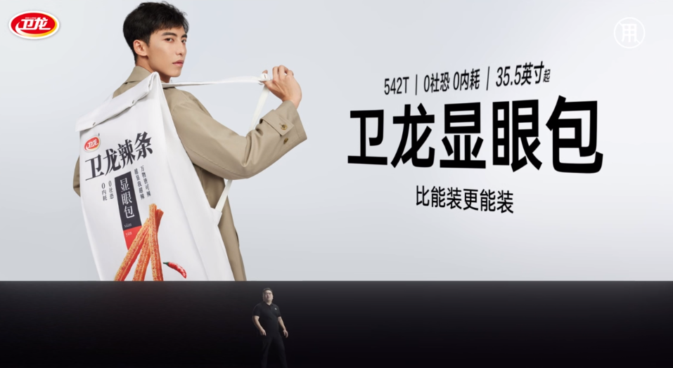 人山人海的现场、巨大电子屏幕搭配一位高层演讲、光影交错间透露着极简现代风的产品展示,卫龙在365度全方位模仿手机厂商风格方面已经是老手,连主持人都有个“CXO”的头衔。此外,发布会还调侃了手机尺寸与内存,称一个卫龙显眼包,可以装下542个友商,“比装更能装”。