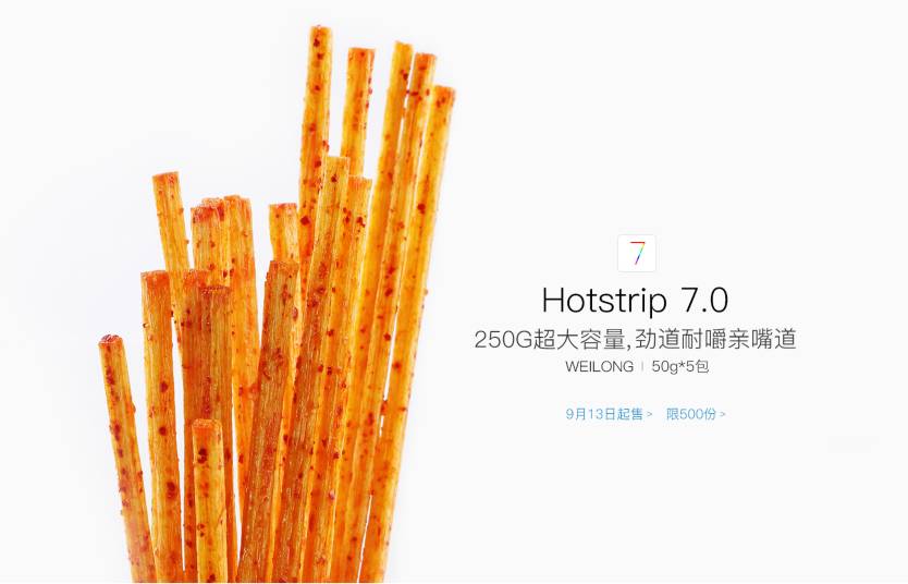 2016年9月8日,在iPhone 7发布的当天,卫龙也“发布”了Hotstrip7.0,一举抢下苹果风头喜提当天热搜。而Hotstrip其实是辣条的中式英文名,由hot(火热)与strip(长条)组合而成。卫龙的产品介绍也完全复刻了苹果的语言风格,称“它带来了先进的口感、更胜以往的美味和更长的咀嚼力、富有沉浸感、色彩更明亮丰富的Hotstrip 外包装,以及防溅抗水的特性。它周身的每一处,都闪耀着强大美食的光芒。这,就是Hotstrip。”