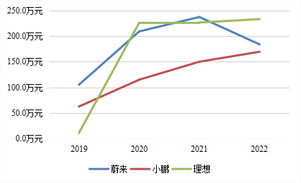 从这个角度看,理想的人力资源投入是按照业务的节奏进行的吗?2022年,理想的交付量上升了,劳动生产率却更低了,人力资源的投放似乎还没有有效转化。至于是不是投放的节奏过快,就要看后续的表现了。有一种极大的可能是,理想基于对未来的乐观预期,提前储备人员,如果乐观真的能兑现,这也算是合理操作。另外,图1中其人均营收依然相对稳健,可能是他们如此乐观的原因吧。