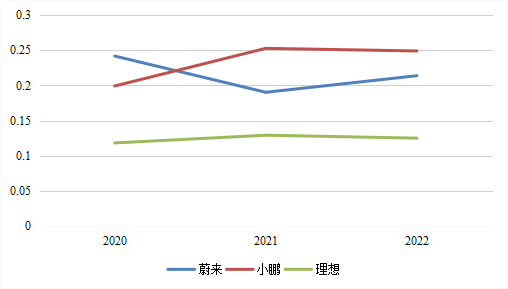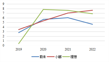 图3:“蔚小理”销管费用率变化图资料来源:穆胜咨询、蔚来财报、小鹏财报、理想财报