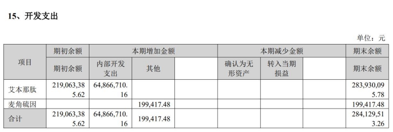 常山药业的2022年年报显示,艾本那肽的开发支出累计达到2.84亿元,其中2022年度支出6486.67万元,占该年度研发投入总金额2.10亿元的30.88%。
