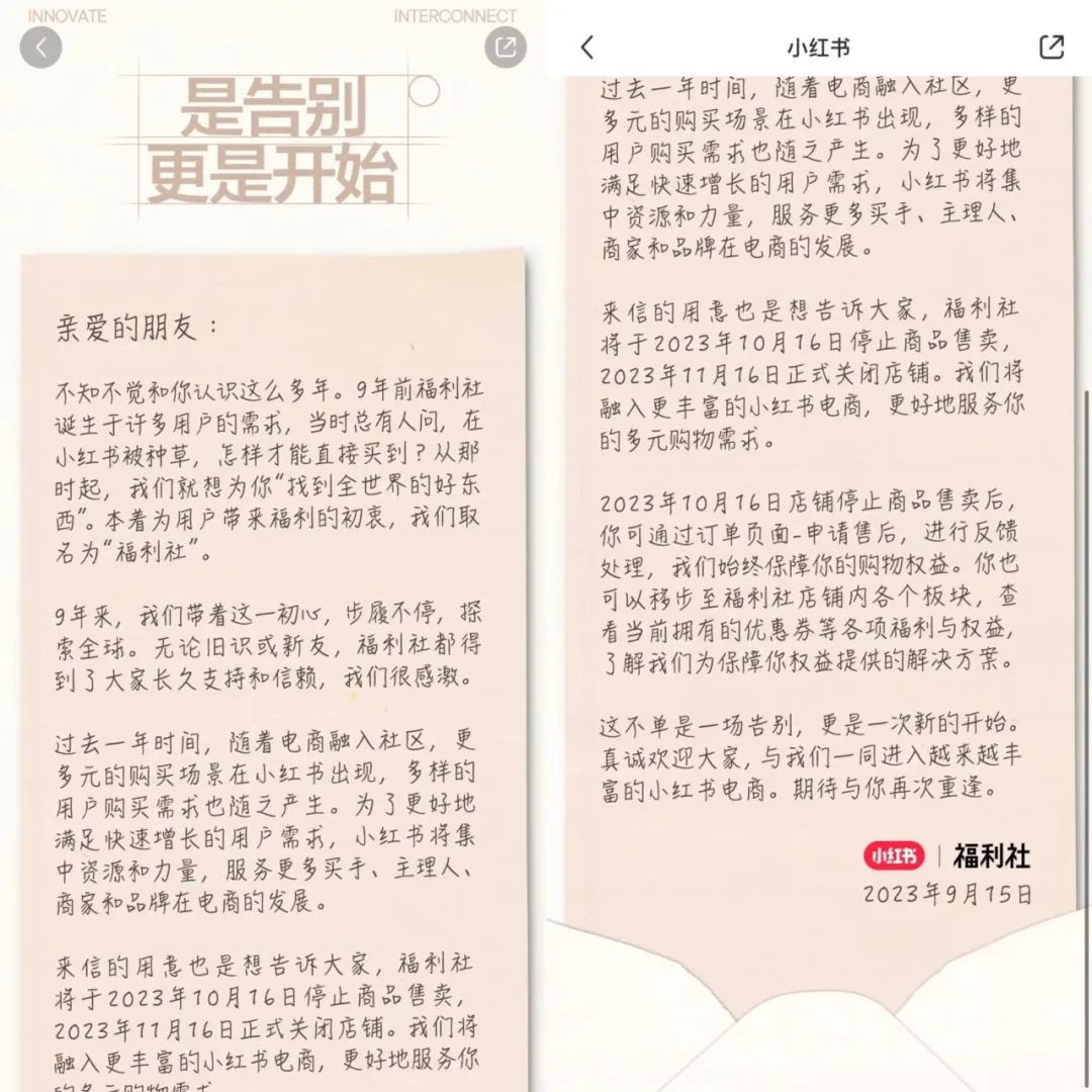9月15日,小红书“福利社”发布致用户的一封信,表示将于2023年10月16日停止商品售卖,店铺停售后,用户可以通过订单页面-申请售后,进行反馈处理。最终,将在2023年11月16日正式关闭店铺。