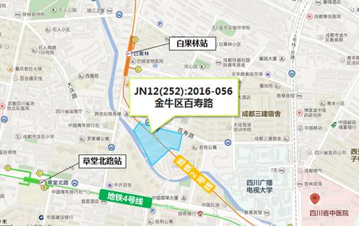 地块位于一环百寿路南,临近地铁2号线白果林站和地铁4号线草堂北路站,交通通达;南临磨底河,被石人公园、浣花溪公园、文化公园三大公园围绕,生态宜居;毗邻西门传统三大商圈:以美食闻名的一品天下商圈、以遗址博物馆闻名的金沙商圈及以高档居住消费为主的光华商圈,商业配套成熟;同时兼有四川广播电视大学、四川省中医院等配套资源。
