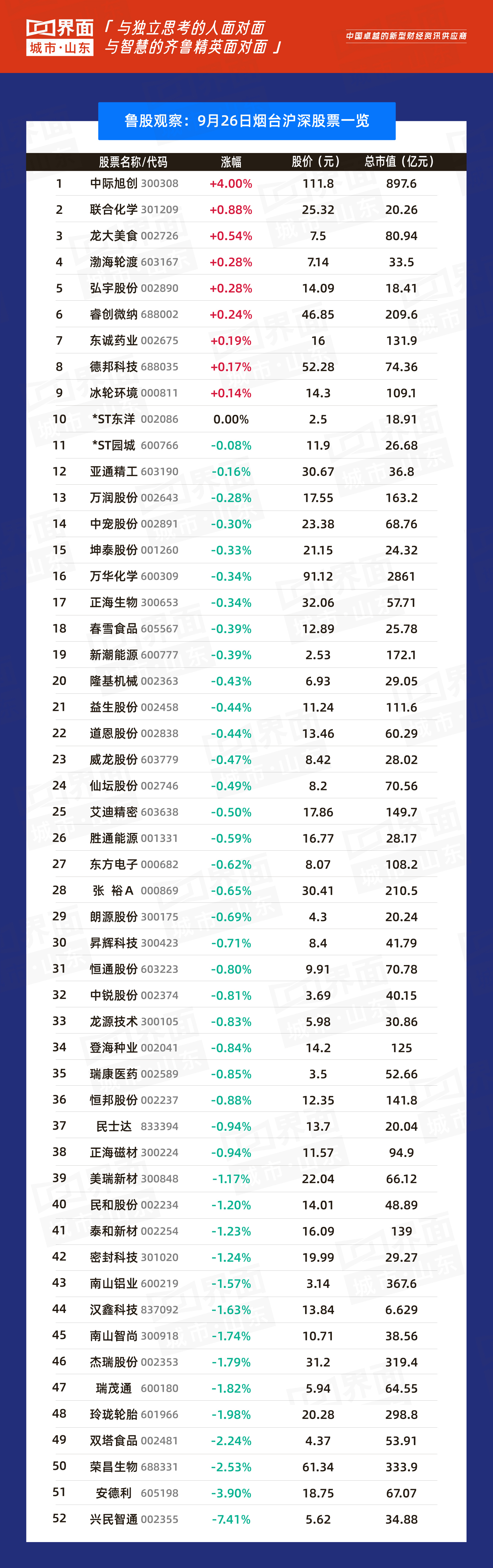 烟台市涨幅榜首:中际旭创(300308),涨幅:4%,股价111.8元,总市值897.6亿元;