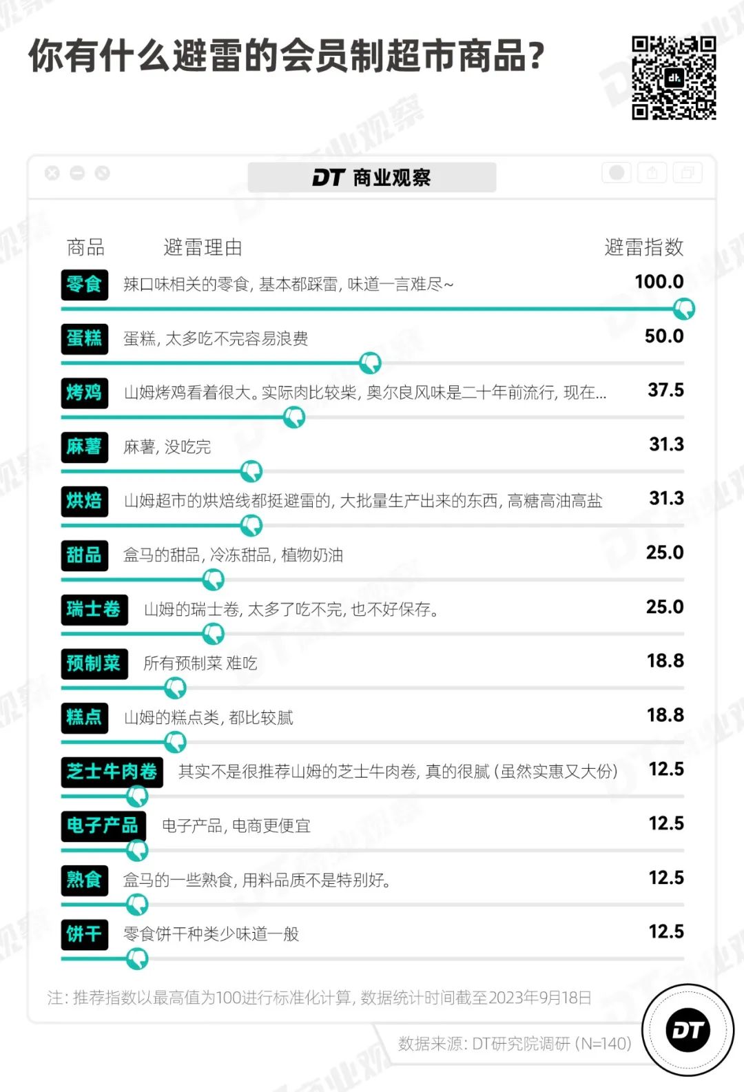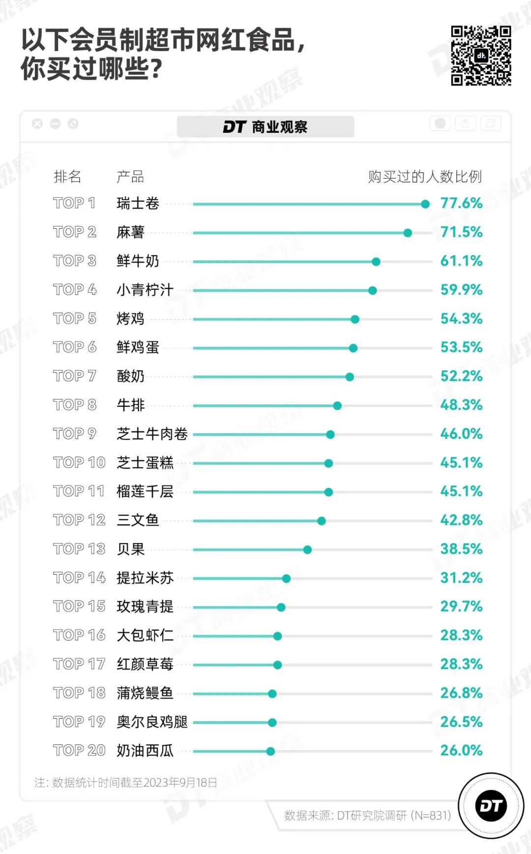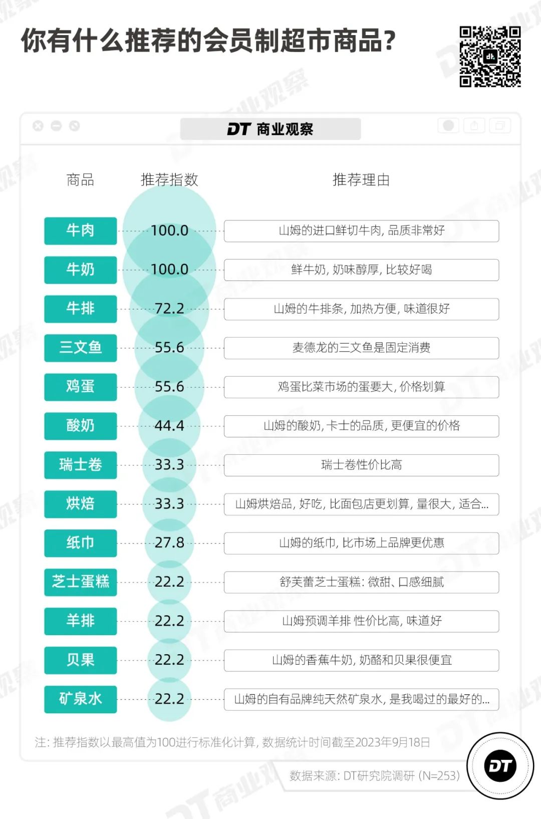《DT商业观察》统计了人们购买过的食品,瑞士卷、麻薯、鲜牛奶、小青柠汁、烤鸡,是会员制超市的美食招牌。