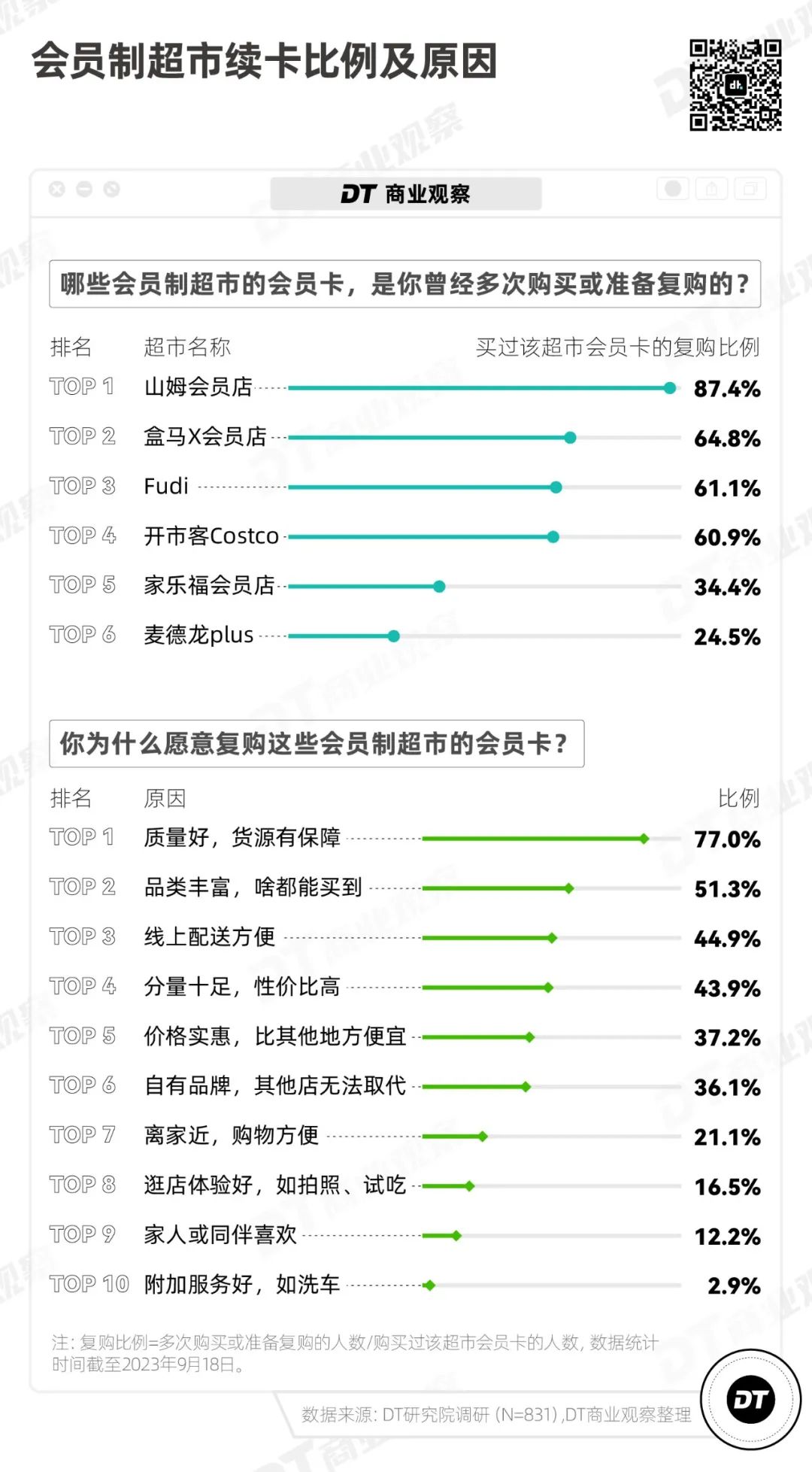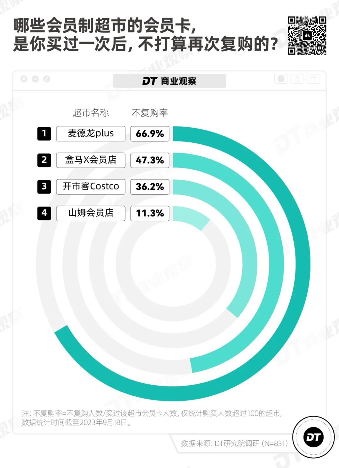 《DT商业观察》的调研数据显示,麦德龙的“一次性顾客”最多,2/3的麦德龙会员不打算再次购卡,山姆的不复购比例相对最低,只有11.3%。