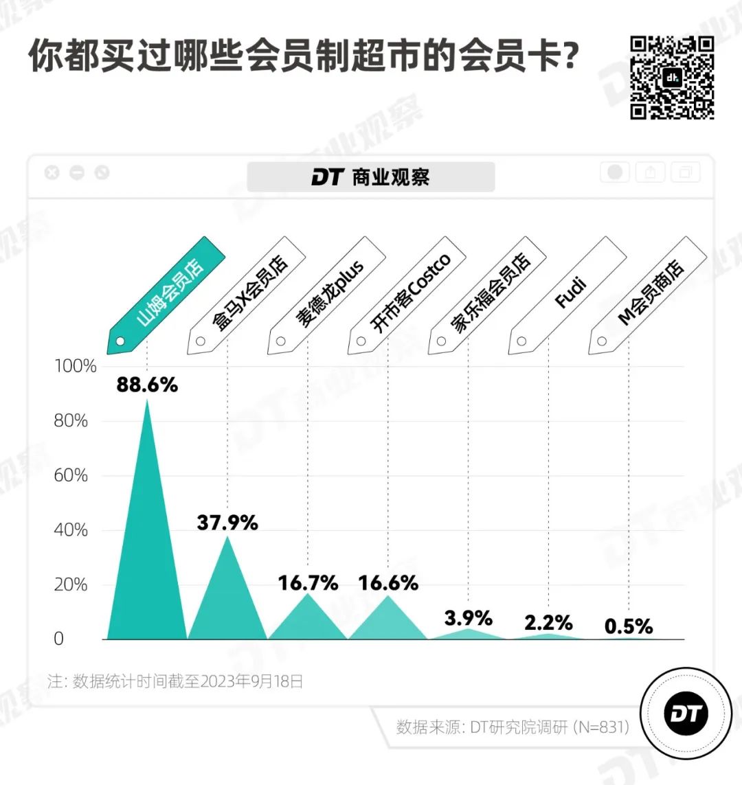 在参与调研的读者中,近9成人买过山姆会员卡,是盒马会员的2倍多,其次是Costco、麦德龙、家乐福和Fudi。