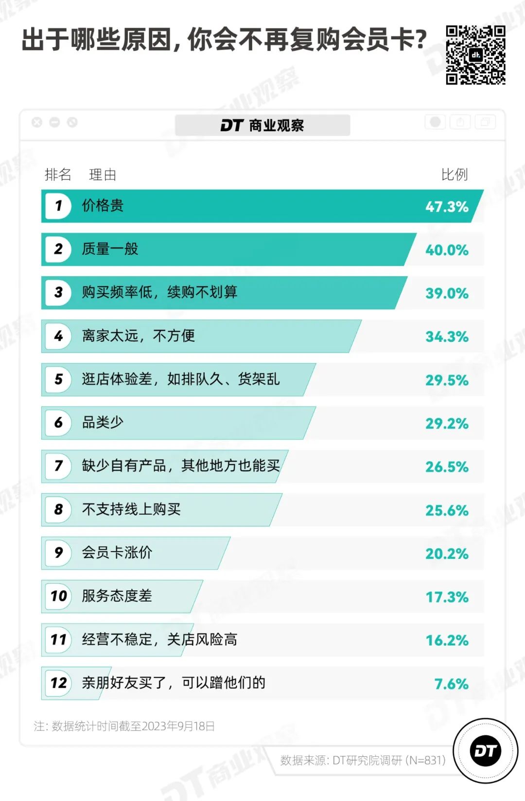 在不愿意续卡的原因中,接近一半的消费者选择了“价格贵”,4成人选择“质量一般”,39%的人选择了“购买频率低,续购不划算”。