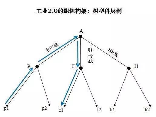 如图所示,这是工业2.0的组织构架,以A为顶点,A可以是一个企业的CEO,向下我只画了三条线,但实际上企业管理要比这个多的多。整个管理决策体系就是树型的科层组织,它与工业2.0相适应,但也存在弊端。