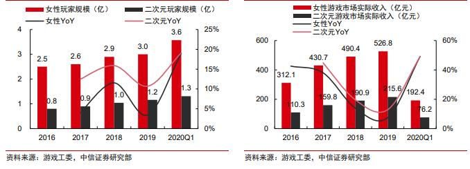 在闭门研发《原神》的时间里,二次元市场节节攀升。据中信证券研究部相关报告显示,中国二次元游戏用户规模从2016年的0.8亿增长到2020年Q1的1.3亿,实际收入从2016年的110.3亿元增长至2019年的215.6亿元。