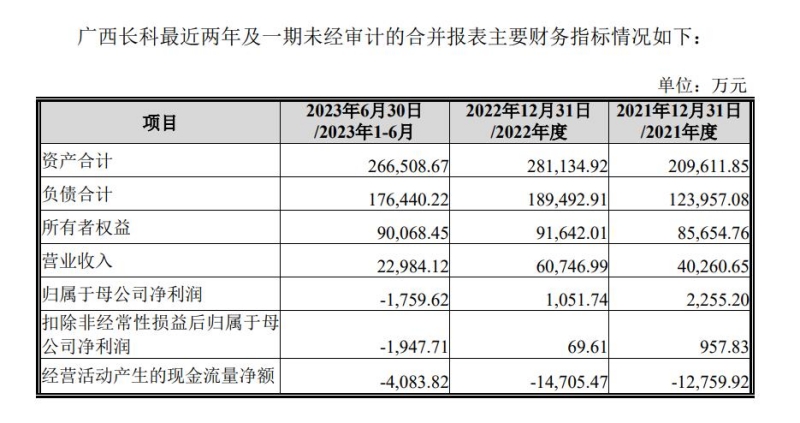 2023年6月30日,广西长科的总资产合计26.65亿元,所有者权益(净资产)为9.01亿元;2022年年末,其总资产为28.11亿元,净资产为9.16亿元。值得注意的是,广西长科在2022年度的归母净利润1051.74万元不足上年的一半,扣非归母净利润仅69.61万元;2023年上半年归母净利润出现1759.62万元的亏损,扣非归母净利润为亏损1947.71万元。