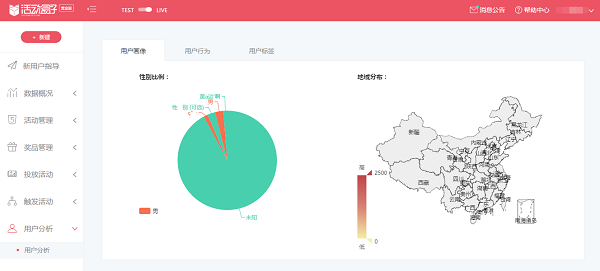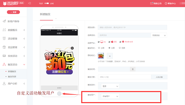 如下图所示,运营在做活动时,可以设置活动触达的用户,是把活动推送给所有用户还是根据性别、地域等用户基本属性进行推送。