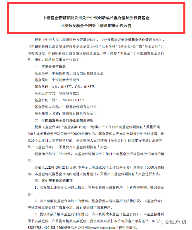 9月19日,中银腾利披露的基金基金合同终止及基金财产清算的公告也表明,该基金的最后运作日为2023年9月18日,并于2023年9月19日进入清算程序。截至2023年9月18日日终,基金已连续60个工作日出现基金资产净值低于5000万元的情形。根据基金合同约定,已触发终止《基金合同》条款。
