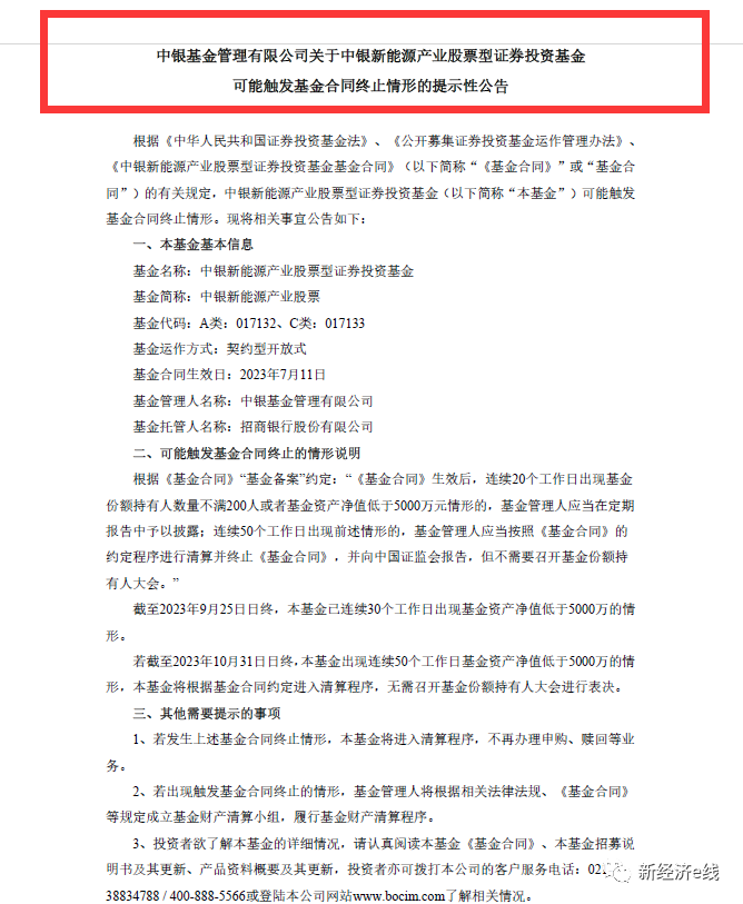 2023年9月26日,中银基金发布关于中银新能源产业股票型证券投资基金可能触发基金合同终止情形的提示性公告称,根据《基金合同》等有关规定,中银新能源产业股票型证券投资基金可能触发基金合同终止情形。