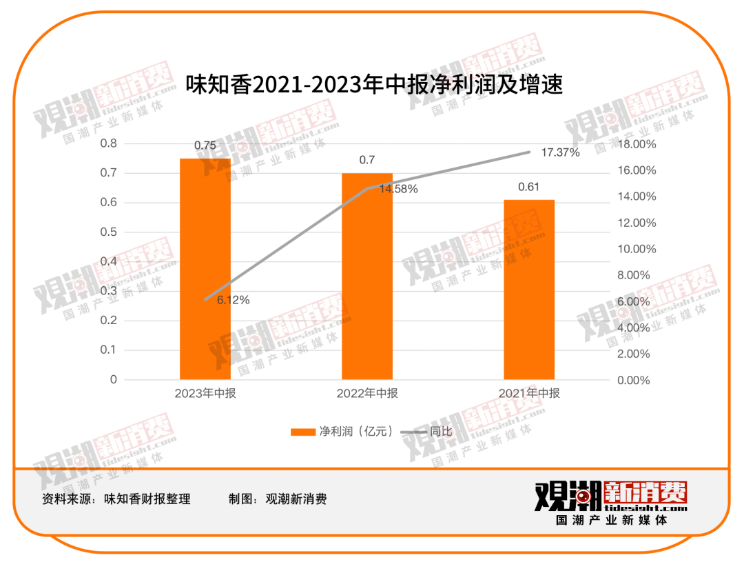 2023年上半年,味知香实现净利润0.73亿元,同比增长6.12%,相较前两年14.58%和17.37%的同比增速明显放缓。