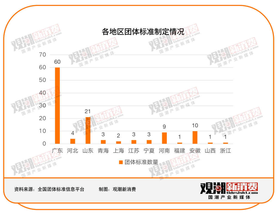 团体标准中,国家团体制定标准20条,地方团体制定标准118条。地方团体标准中,广东、山东、安徽、河南标准数量排名前列,占比达84.7%。