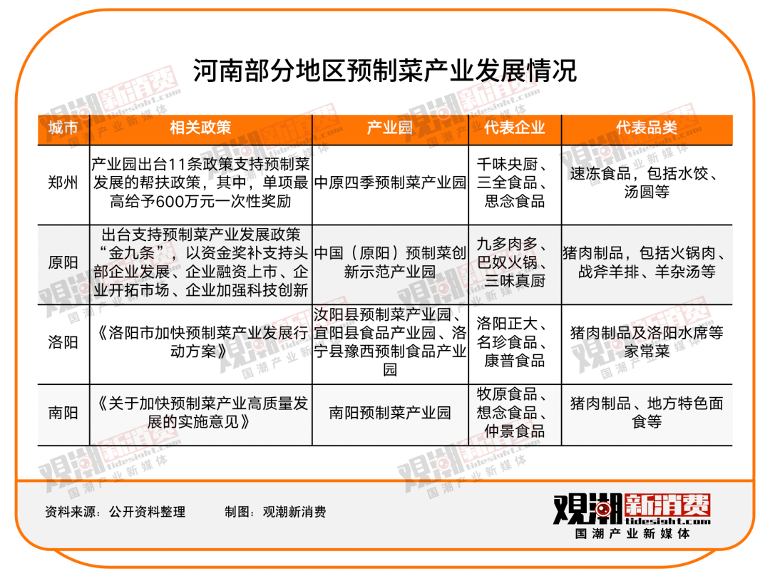 河南的预制菜产业发展也十分迅速。2022年10月27日,河南省人民政府办公厅印发《河南省加快预制菜产业发展行动方案(2022—2025年)》,方案中提出要从六大方面推动预制菜产业高质量发展,以重点单品集中突破带动特色产品多点扩张,以龙头企业集聚发展带动产业链上下游企业协同。到2025年,全省规模以上预制菜企业主营业务收入突破1000亿元。
